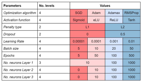 The number of neurons in the first two layers and the dropout value seem to be irrelevant for all datasets according to the D-optimal models; this was also confirmed by the well-balanced frequency distributions observed for both the GA and GS architectures. In this case, a better balance between low and high levels (red and blue colors) could be observed in the frequency distributions between the best GA and GS architectures.