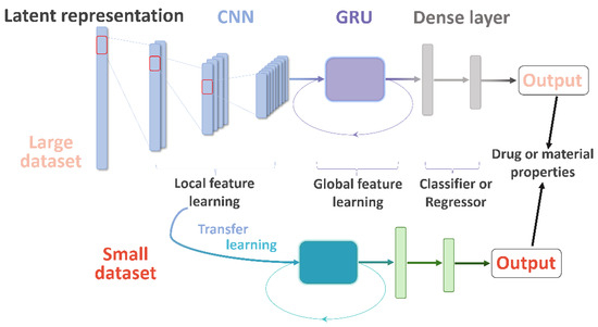 Herein, we describe the convolutional recurrent neural network and transfer learning (CRNNTL) method to tackle the problems with molecular sequence and data scarcity. The convolutional recurrent neural network (CRNN) is loosely inspired by the architectures proposed in the applications of polyphonic sound detection and electrocardiogram classification [25,26,27], which integrates the advantages of CNN and RNN (gated recurrent units used here, named GRU) at the same time. The concept is illustrated in Figure 1 in which the model is constituted by the CNN, GRU, and dense layer parts. Firstly, the CRNN model is tested using diverse benchmark datasets including drug and material properties and compared with CNN and classical methods, such as random forest (RF) and SVM. Then, an isomers-based dataset is trained by CRNN and CNN to elucidate the improved ability of CRNN in the global feature learning. Next, we demonstrated that the transfer learning part of CRNNTL could be used to improve the performance for scarce bioactivity and material datasets. Finally, the high versatility of CRNNTL was shown by QSAR modeling based on two other latent representations derived from different types of AEs.