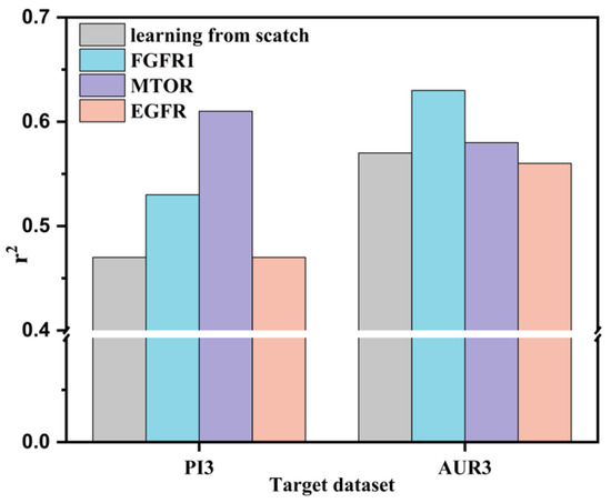 Having settled the transfer learning performance of CRNNTL in the physiological and physicochemical datasets, we turned our attention to the knowledge transfer ability to bioactivities. As shown in the first part, the regression results of AUR3 and PI3 were relatively worse than the other ones because of the small data size (shown in Table 2). Hence, larger datasets, including FGFR1, MTOR, and EGFR, were used to transfer the knowledge into AUR3 and PI3. Figure 2 showed the results of the transfer learning based on the CRNN method. On the one hand, when FGFR1 serves as the source dataset, the r2 of both PI3 and AUR3 increased by about 10% compared to learning from scratch. On the other hand, regarding the MTOR, QSAR for PI3 achieved almost a 30% improvement in r2. However, no improvement was realized in case of AUR3. Despite the adequate QSAR performance and size of the EGFR dataset, there was no statistical improvement when EGFR acted as a source for both the PI3 and AUR3 targets. Therefore, it demonstrated that the transfer learning ability did not only depend on the performance and size of the source dataset.