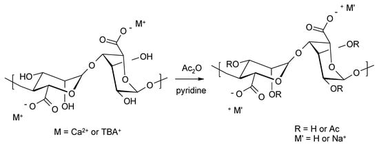 - Skjåk-Bræk, G.; Paoletti, S.; Gianferrara, T. Selective acetylation of mannuronic acid residues in calcium alginate gels. Carbohydr. Res. 1989, 185, 119–129. [Google Scholar] [CrossRef]