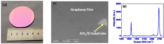 The large-area graphene film grown on Cu foil by CVD was transferred onto 2 inch SiO2/Si substrate by a standard PMMM-assisted transfer process. The photo of large-area graphene film transferred onto 2 inch SiO2/Si substrate is shown in Figure 1a. One can see that the transferred film is very homogeneous, and nearly no defects can be observed with the naked eye. The morphology of graphene transferred onto SiO2/Si substrate is further characterized by a scanning electron microscope (SEM). As shown in Figure 1b, one can see that the graphene film is homogeneous except for the damaged area. The Raman spectra of such transferred samples are measured. As shown in Figure 1b, the G-to-2D intensity ratio (IG/I2D) of 0.49 indicates that the graphene film transferred on SiO2/Si substrate is monolayer, and the D-to-G intensity ratio (ID/IG) is as low as 0.038, which suggests that the graphene film has high quality [19,20,21,22].