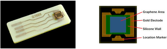 The graphene/SiO2/Si substrate was cut into many ~2 × 2 cm2 pieces and packaged as GBC-100 graphene-based biosensors by Chengdu Ginkgo Electronics Technology Co., Ltd. The photo of the GBC-100 biosensor is shown in Figure 2.