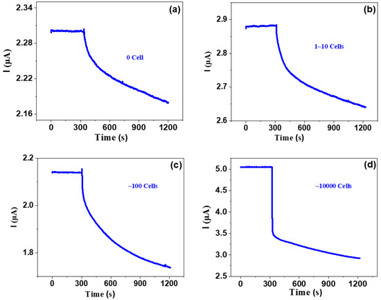 The solutions with various cancer cell numbers were prepared as follows. The SKOV3 cells were inoculated into the six-well plate with 5 × 104 cells/well. The cells to be tested were discarded from the culture medium and washed with PBS three times. The cells were gently blown, and the cell suspension was collected to prepare a cell suspension with a concentration from ca. 200 to 200,000 cells μL−1. The solution without or with various cancer cells was investigated by testing the electrical signal change before and after adding the solution into the cell pool. Firstly, before we added the solution into the cell pool, we applied a fixed voltage (e.g., 0.01 V) and started to record the current time data; during the test process, we added 50 μL of solution dropwise with a pipette, and we could observe that the current signal obviously changed. By comparing the signal just before and after adding the solution without and with various cell numbers, we were able to obtain useful information.