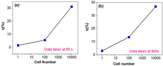 The response sensitivity with cell number at various fixed detection times of 60 and 900 s is investigated. The typical data are shown in Figure 5. As shown in Figure 5a, when the detection time is fixed at 60 s, one can observe that as the cell number increases from several to ten thousand, the response sensitivity increases from 2% to ~30%. As shown in Figure 5b, when the detection time is fixed at 900 s, the response sensitivity increases from 3% to ~37%. From these results, we can make two important conclusions: (i) although the detection time is as short as 1 min and the cancer cell number is as low as ~1 (the early stage in CTCs), the response sensitivity is high enough, which suggests that the present detection method based on a graphene-based biosensor is very sensitive and rapid; (ii) if the response sensitivity for some cancer cells is not very high, one can improve it by simply increasing the detection time.