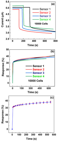 Time dependence of currents (a) and response (b) of four different sensors. (c) Time dependency of response with error bars; data calculated from (b).