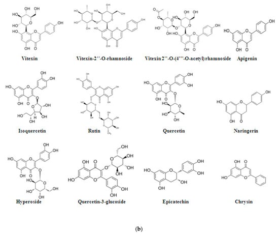 The high-performance liquid chromatography with diode-array detection (DAD-HPLC) was analyzed to identify rutin, quercetin-3-glucoside, caftaric and caffeic acid. A structural elucidation of quercetin, quercetin-3-O-β-glucoside, epicatechin, naringenin was conducted [13]. A combination of 1D, 2D NMR, MS and UV was used. Altogether, the phytochemical analysis showed that flavonoids are highly present in flowers as vitexin-2″-O-rhamnoside, hyperoside and oligomeric procyanidins.