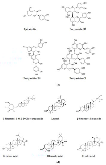 Chemical structure of acids quantified in C. monogyna fruits, plants and flowers. (a) Phenolic acids; (b) flavonoids and glycosylates derivates in C. monogyna fruits, plants and flowers; (c) other flavonoids: epicatechin and procyanidin; (d) triterpenoid compounds.