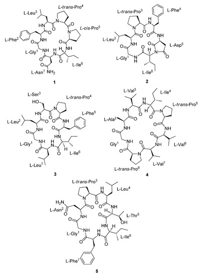 - Han, J.; Huang, M.; Wang, Z.; Zheng, Y.; Zeng, G.; He, W.; Tan, N. Cyclopentapeptides from Dianthus chinensis. J. Pept. Sci. 2015, 21, 550–553. [Google Scholar] [CrossRef] [PubMed]