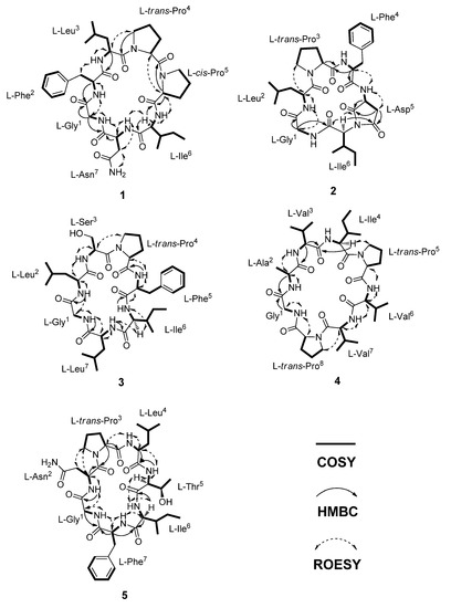 In the HMBC and ROESY experiments, the cyclic feature and amino acid sequence of 1 were elucidated by the correlations observed between the amino acid Hα and continuous amide group (CONH). Therefore, the linear sequence of 1 was identified as G-F-L-Pa-Pb-I-N. Also, the HMBC correlation from Gly-Hα (δH 3.40 and 3.55) to Asn-C=O (δC 172.3) as well as the ROESY correlation between Gly-NH (δH 8.70) and Asn-Hα (δH 4.18) established the cyclic heptapeptide as cyclo-G-F-L-Pa-Pb-I-N (Figure 2). The amino acid sequence of 1 was further confirmed by analysis of the ESI–MS/MS fragment ions. Presumably, though there were several ring-opening sites, it occurred at two preferred positions at Proa4-Prob5 and Ile6-Asn7, respectively. Each the linear sequences, Prob5-Ile6-Asn7-Gly1-Phe2-Leu3-Proa4 (b7PbPa) and Asn7-Gly1-Phe2-Leu3-Proa4-Prob5-Ile6 (b7NI) was certified by acylium ions (bnPbPa and bnNI) and after loss of CO (anNI) at m/z 642 (b6PbPa), 626 (b6NI), 529 (b5PbPa and b5NI), 404 (a4NI), 364 (b4PbPa-H2O), 319 (b3NI), and 211 (b2PbPa), corresponding to the successive loss of amino acid residues (Figure S9).