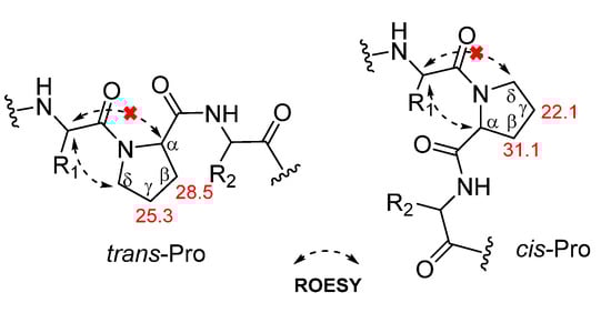 - Siemion, I.Z.; Wieland, T.; Pook, K.H. Influence of the distance of the proline carbonyl from the β and γ carbon on the 13C chemical shifts. Angew. Chem. Int. Ed. Engl. 1975, 14, 702–703. [Google Scholar] [CrossRef]