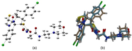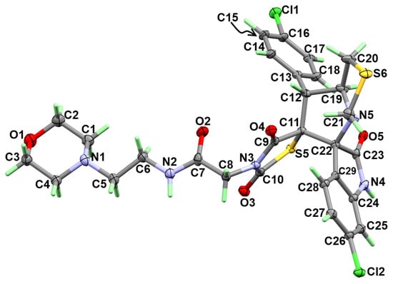 The crystal of 5a was immersed in cryo-oil, mounted in a loop and measured at a temperature of 120 K. The X-ray diffraction data were collected on a Rigaku Oxford Diffraction Supernova diffractometer using Cu Kα radiation. The CrysAlisPro [47] software package was used for cell refinement and data reduction. An analytical absorption correction (CrysAlisPro [47]) was applied to the intensities before structure solution. The structure was solved by the intrinsic phasing (SHELXT [48]) method. Structural refinement was carried out using SHELXL [49] software with the SHELXLE [50] graphical user interface. The crystal was solved in the space group P21 as an inversion twin. The BASF value was refined to 0.1478. The asymmetric unit contained two independent organic molecules and two water molecules. The ring C19B-C29B-S6B-C21B-N4B was slightly disordered, leading to small positive and negative electron densities near the atom S6B. No disorder model was used in the final refinement. The NH hydrogen atom was located from the difference Fourier map and refined isotropically. The H2O hydrogen atoms were also located from the difference Fourier map but constrained to ride on their parent oxygen with Uiso = 1.5 Ueq (parent atom). All other hydrogen atoms were positioned geometrically and constrained to ride on their parent atoms, with C-H = 0.95–1.00 Å and Uiso = 1.2·Ueq (parent atom).
