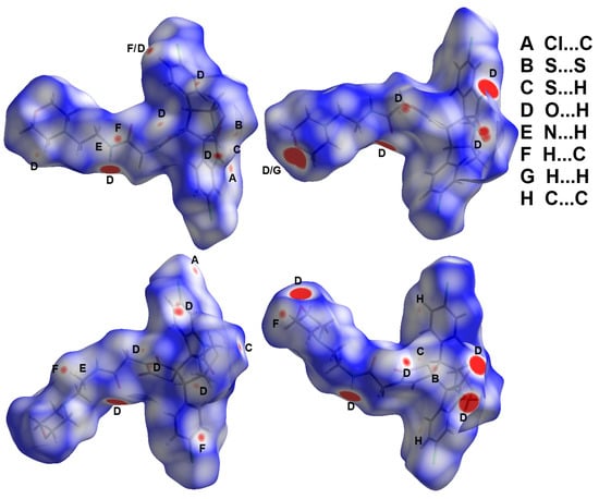 In Figure 3, the dnorm maps of both molecules are also presented. The red regions indicate the atomic sites included in strong intermolecular interactions with the neighboring molecules. It is clear that the molecular packing in the studied system is controlled by many short contacts such as Cl...C, S...S, S...H, O...H, N...H, H...C, C...C and H...H interactions.