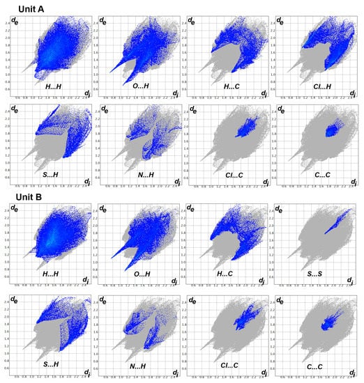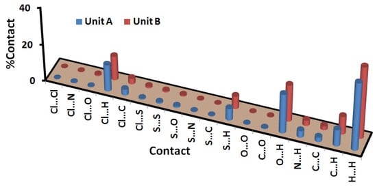 In addition, fingerprint plots gave a quantitative summary for all intermolecular interactions. Decomposed fingerprint plots enabled us to calculate the percentage of each intermolecular interaction (Figure 4). The distribution of all possible intermolecular interactions is shown in Figure 5. It is clear that the H...H (38.8%), O...H (19.9%), Cl...H (13.1%) and H...C (9.7%) contacts are the most dominant in molecular unit B in the atom numbering of the heavy atoms (unit B). The results for the other molecular unit (unit A) are almost the same (Table S1, Supplementary Materials).