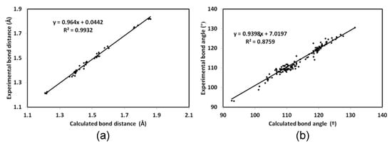 Correlations between the calculated and experimental (a) bond distances, and (b) bond angles.