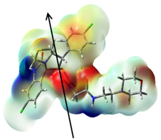 The charges at the different atoms of 5 are collated in Table 6. The results indicate the presence of a number of negatively charged atomic sites, including N, O and the majority of C sites. There are five oxygen atoms and five nitrogen sites in 5a where the exo carbonyl oxygen and the neighboring amidic nitrogen atoms are the most negative, respectively. All carbon atoms bonded to N or O atoms have highly positive natural charges. In addition, the NH protons are the most positive hydrogen atoms (0.4475 and 0.4196 e). These results are in good agreement with the molecular electrostatic potential map (MEP) shown in Figure 8. In the MEP, the red colored areas are related to regions of high electron density while the blue colored areas are related to highly electron-deficient regions. The red regions are related to carbonyl oxygen while the blue regions are close to the NH protons. The studied compound has a polar nature with a net dipole moment of 2.5735 Debye, and the direction of the dipole moment vector is shown in Figure 8.