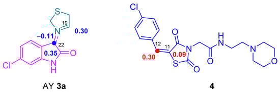 In a polar reaction involving non-symmetric species, the most favorable reaction path involves the two-center interaction between the most electrophilic and the most nucleophilic centers [43]. Many studies have shown that analysis of the electrophilic Pk+ and nucleophilic Pk− Parr functions [44], resulting from the excess of spin electron density gathered via the GEDT [38], is one of the most accurate and insightful tools for the analysis of the local reactivity in polar and ionic processes. Hence, according to the characteristics of the reagents, the Pk− nucleophilic Parr functions of AY 3a and the Pk+ electrophilic Parr functions of the ethylene derivative 4 were analyzed (see Figure 9).