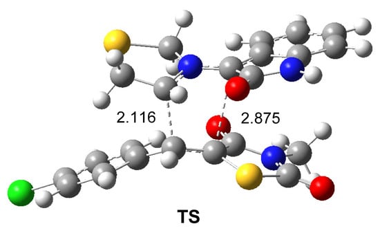 The geometry of the transition state structure TS is given in Figure 10. The C–C distances between the two pairs of interacting carbons are 2.116 (C12–C19) and 2.875 (C11–C22) Å. These distances indicate that this TS is associated with a highly asynchronous C–C single-bond formation process, in which the shorter C12–C19 distance corresponds to that involving the most electrophilic carbon C12 of the ethylene derivative 7. These C–C distances, which are higher than 2.1 Å, indicate that the formation of the two C–C single bonds had not begun at the TS [38]. Analysis of the intrinsic reaction coordinates [45] associated to the highly asynchronous TS indicated that this 32CA reaction takes place through a non-concerted two-stage one-step mechanism [46] in which formation of the second C11–C22 single bond begins when the first C12–C19 single bond is completely formed.