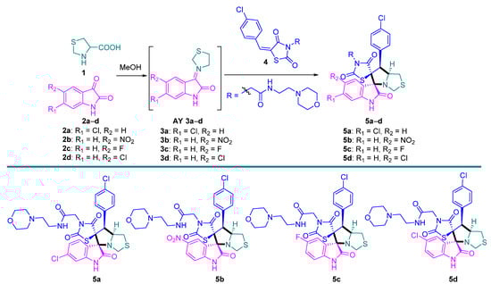 The straightforward regio- and diastereoselective synthesis of the desired bi-spirooxindole-engrafted rhodanine analogs 5a–d is shown in Scheme 1. The requisite starting material named (E)-2-(5-(4-chlorobenzylidene)-2,4-dioxothiazolidin-3-yl)-N-(2-morpholinoethyl)acetamide 4 was synthesized following the method reported in the literature [29]. Employing the one-pot multicomponent-based 32CA reaction approach of the arylidene rhodanine analog 4 with di-carbonyl compounds (6-chloroisatin 2a; 5-nitroisatin 2b; 5-fluoroisatin 2c; 5-chloroisatin 2d) and thioproline 1 under reflux conditions in MeOH for 2 h produced the target stereoselective bi-spirooxindole-engrafted rhodanine analogs 5a–d. The reaction proceeded initially with isatins 2a–d reacting with the secondary amino acid (L-thioproline) 1 to generate the azomethine ylides in situ (AYs 3a–d). In the second step, the generated azomethine ylides (AYs 3a–d) reacted with the arylidene rhodanine analog 4 with four possible approach modes: two regioisomeric approach modes of the aryl-substituted carbon of 4 to the two carbons of the azomethine ylides (AYs) framework of AYs 3a–d, named ortho and meta, and two stereoisomeric approach modes of the C–C double bond of 4 to AYs 3a–d, named endo and exo. The four possible alternative reaction paths are shown in Scheme 2. The formation of the bi-spirooxindole-engrafted rhodanine analogs 5a–d indicates that this 32CA reaction is completely ortho regioselective and exo stereoselective, taking place via the transition state structure TS-ox. The spectral data of the bi-spirooxindole-engrafted rhodanine analogs 5a–d were assigned and elucidated and were found to be in good agreement with the proposed structure. The chemical structure of 5a was further confirmed by single-crystal X-ray diffraction analysis.