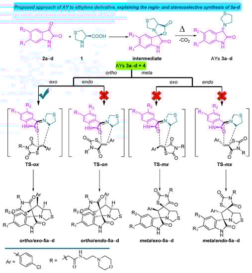 Synthesis of compounds 5a–d via 32CA reaction of AYs 3a–d with ethylene derivative 4.