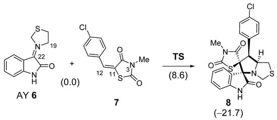 For the study of the mechanism of the 32CA reactions of AYs 3a–d with ethylene 6, a reduced model was selected (see Scheme 3). In this reaction model, the substituents present at the aromatic ring of AYs 3a–d were removed, while the chain present at the amide N3 nitrogen of the ethylene derivative 4 was replaced by a methyl group in ethylene 7. Analysis of the CDFT indices of AY 6 and ethylene 7 showed that they have a similar nucleophilic and electrophilic character compared to the experimental AYs 3a–d and ethylene 4, indicating that the former will present a similar reactivity (see Table 7). Analysis of the reaction path indicated that this 32CA reaction takes place though a one-step mechanism. The B3LYP/6-31G(d) relative energies are given in Scheme 3. The activation energy associated to this 32CA reaction is 8.6 kcal·mol−1, with the reaction being exothermic by −21.7 kcal·mol−1.