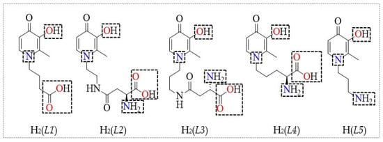 The 3-hydroxy-4-pyridinones under study are featured by different protonable groups highlighted in Figure 1 with dotted rectangles. The ligands’ structure consists of a hydroxyl group as substituent on the N-heterocyclic ring, a -NH2 and/or -COOH on the alkyl chain and a pyridinone nitrogen atom (proton provided by an excess of inorganic acid) [13], each of them with different acidity. The 3-hydroxy-4-pyridinones protonation constants have been already reported in the literature at I = 0.15 mol L−1 in NaCl(aq), T = 298.15 and 310.15 K (Table S1) [13].