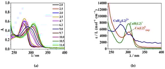 Concerning the UV–Vis spectrophotometric behaviour, a representative example of the spectra recorded for the Cu2+/H2(L2) system is shown in Figure 3a. An absorption band with λmax = 278 nm can be observed at pH ~ 2.0–2.5. Its intensity increases with the pH, up to pH ~ 3.5, and then it starts to decrease, up to pH ~ 9.0–9.7, undergoing a bathochromic shift. Above pH ~ 10.0, the band intensity raises again with a subsequent red shift, up to pH ~ 11.0. The deconvolution of the UV–Vis data allowed us to calculate the molar absorptivity (ε/L (mol−1 cm−1)) values for each metal-ligand species. As an example, a graphical representation of the ε determined for the Cu2+/H2(L2) system is reported in Figure 3b. At I = 0.15 mol L−1 in NaCl(aq), T = 298.15 K, the molar absorptivities are: εmax(CuH2(L2)2+) = 7514 at λmax = 280 nm, εmax(CuH(L2)+) = 7813 at λmax = 302 nm, εmax(Cu(L2)(aq)) = 5222 at λmax = 304 nm.