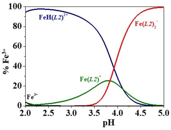 A further deepening on the speciation of the different Fe3+/(3,4-HP) systems may be performed considering the distribution diagrams drawn from potentiometric data at I = 0.15 mol L−1 in NaCl(aq) and T = 298.15 K, as reported in Figure 4 for H2(L2) and in Figure S2 for H2(L1), H2(L4) and H(L5).