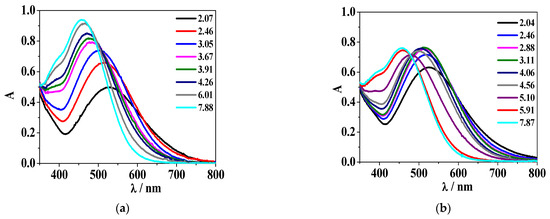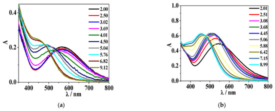 In the case of the Fe3+/H(L5) system, at metal/ligand stoichiometric conditions (Figure S4), the mentioned band with λmax = 568 nm at pH ~ 2.0, as well as its two hypsochromic shifted bands (λmax = 510 nm, 460 nm) at pH ~ 4.9 and 5.9–6.0, respectively, are observed. For cFe3+/cligand = 1/2 and cFe3+/cligand = 1/3 (Figure 6), the first recorded band is featured by λmax = 536 nm at pH ~ 2.0, with a blue shift occurring at pH ~ 4.9 with a band at λmax = 515 nm, whilst the last blue shift corresponds to a band at λmax = 460 nm, similarly to the previous described spectra.