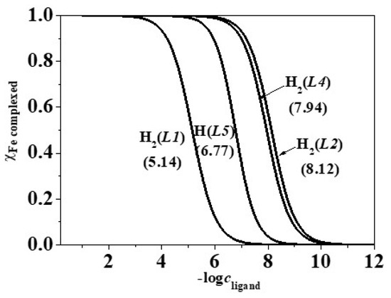 As regards the iron-containing systems, the formation of precipitate at pH ~ 5.0 during the potentiometric measurements allowed us to evaluate the sequestering ability of the ligands in a quite narrow pH range. As can be observed in Figure 8, the pL0.5 trend at pH = 4.0 is: H2(L2) (8.12) > H2(L4) (7.94) > H(L5) (6.77) > H2(L1) (5.14), confirming that, analogously to what was observed for the stability constants, the sequestration is mainly favoured by the presence in the ligand structures of the amide-amino-carboxylic, amino-carboxylic or amino moieties [24] in the alkyl chain bound to the N-heterocyclic ring.
