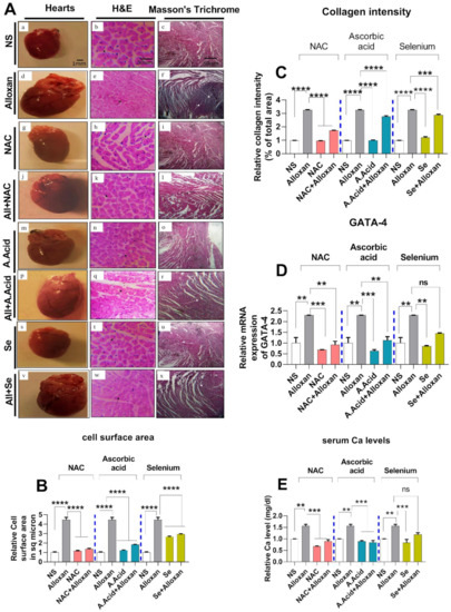 Protective effects of N-acetyl cysteine, ascorbic acid, and selenium in Diabetes induced cardiac hypertrophy. (A) Representation of morphological images of hearts. Corresponding sections of cardiac tissues presented by Hematoxylin and Eosin (H & E) and Masson’s Trichrome staining are shown. NS (a,b,c), Alloxan (d,e,f), NAC (g,h,i), All+NAC (j,k,l), A.Acid (m,n,o), All+A.Acid (p,q,r), Se (s,t,u), All+Se (v,w,x). NS: Normal Saline, All: Alloxan, NAC: N-acetyl cysteine All+NAC: Alloxan+N-acetyl cysteine A.Acid: Ascorbic acid All+A.Acid: Alloxan+Ascorbic acid Se: Selenium All+Se: Alloxan+Selenium, scale bar = 1mm, scale bar = 50 µm, respectively, In H & E staining, black arrows indicate cell size which is measured by Spotcam W Software (computer-assisted modeling). In Masson’s Trichrome staining panel, the white arrows indicate an area with fibrosis. (B) Graphical representation of cross-sectional cell size examination by SpotCam W software. (C) Graphical representation of collagen deposition in rat heart tissues by MIPARTM.2017 software. (D) Relative mRNA expression of GATA 4 (n = 6) GAPDH was used as an internal control. (E) Analysis of serum calcium levels in pathology model (n = 6). Data are presented as mean ± SE of n biological samples. Significant differences are shown as p-values. Statistical analysis was performed using one-way ANOVA followed by Tukey’s test. (**): p < 0.01), (***): p < 0.001, (****): p < 0.0001.