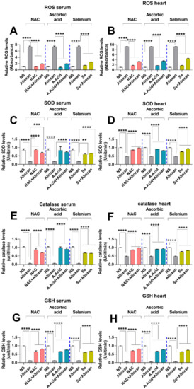 Enzymatic antioxidants, such as superoxide dismutase (SOD), catalase (CAT), and reduced glutathione (GSH) are key components in the defense mechanisms against oxidative stress. SOD is regarded as a free radical scavenger, which can directly scavenge the reactive oxygen species and acts as first line of defense against ROS-induced damages. To examine the SOD activity, we performed SOD assay between the diseased group and those treated with antioxidants. Results show that alloxan administration impaired the standard values of SOD, CAT, and GSH profiles (Figure 3C,D), which could be due to ROS production (Figure 3A,B). The therapeutic potential of antioxidant N-acetyl cysteine, ascorbic acid, and selenium was also investigated. Our data show that the SOD activity was significantly decreased in the alloxan-treated group as compared to normal subjects both in serum and heart tissue homogenates. Specifically, the SOD activities in serum were significantly recovered (elevated) in disease groups when treated with antioxidants. The protective effects of N-acetyl cysteine treatment (alloxan+ N-acetyl cysteine) and ascorbic acid treatment (alloxan + ascorbic acid) were higher than for the selenium treatment (alloxan+ selenium). However, the levels of SOD were higher in heart tissue compared to the serum of disease groups. Of note, the serum data shows that compared to selenium, N-acetyl cysteine and ascorbic acid exhibited a better scavenging potential against ROS-induced oxidative damage.