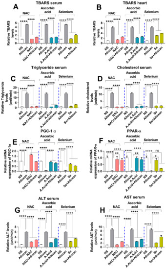 In contrast, TBARS levels were significantly decreased in the disease group treated with antioxidants, i.e., N-acetyl cysteine, ascorbic acid, and selenium as compared to the alloxan-treated group. N-acetyl cysteine (alloxan+N-acetyl cysteine) and ascorbic-acid treatment (alloxan+ascorbic acid) conferred more protective effects against oxidative damage as compared to selenium (alloxan+selenium), both in the serum and heart tissue homogenates (Figure 4A,B).