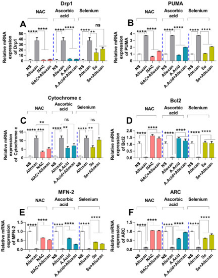 Cytochrome c expression is considered to be regulated by hypertrophic stimuli [44]. Therefore, we evaluated the relative expression of cytochrome c through real-time PCR in experimental groups. A significant increase in the cytochrome c mRNA expression was observed in the disease group. In contrast, when treated with antioxidants, a statistically significant decrease in cytochrome c mRNA level was observed in N-acetyl cysteine treatment (allox-an+N-acetyl cysteine), and in ascorbic treated groups (alloxan+ascorbic acid) compared to selenium treatment (alloxan+selenium) (Figure 5C). Collectively, the antioxidant-mediated down-regulation of Drp1, PUMA, and cytochrome c expression indicates the protective effects of antioxidants against mitochondrial oxidative stress.