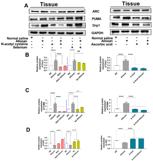 Mitochondrial dysfunction is considered a root cause of hyperglycemia in type 1 diabetes. Therefore, we aimed to examine the expression of Drp1 and PUMA in a diabetes-induced cardiac hypertrophy model. It is understood that Drp1 plays a major role in maintaining mitochondrial morphology and is a key regulator of mitochondrial fission [52]. The upregulation of Drp1 in various cell types occurs due to an imbalance between the mitochondrial fission and fusion, which is mainly caused by an impairment of the electron transport chain and ATP production. Our data show that the expression of Drp1 is increased in the disease group, compared to the control group Figure 5A and Figure 6A,B) both at the mRNA and protein levels. However, the treatment with N-acetyl cysteine significantly reduced the expression of Drp1 in comparison to the untreated diabetic group. The other antioxidants, i.e., ascorbic acid and selenium also showed a reduced expression of Drp1. N-acetyl cysteine exhibited more protection in comparison to ascorbic acid and selenium.