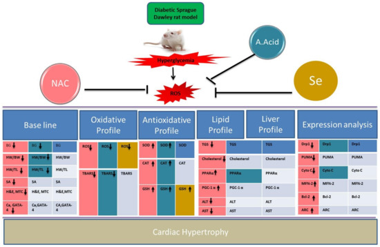 Summary representation of data in alloxan-induced cardiac hypertrophic model. Different colors show scavenging potential of antioxidants in treatment groups (Alloxan+NAC, Alloxan+A.Acid, Alloxan+Selenium). NAC showed better activity in comparison of other antioxidants. Upregulated (↑); Downregulated (↓).