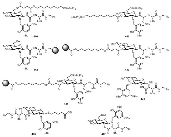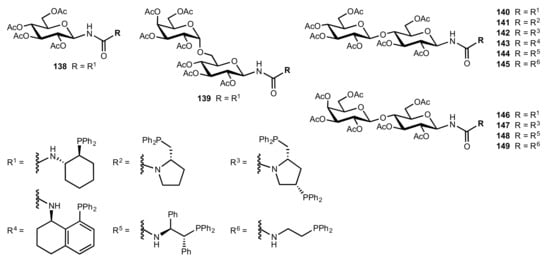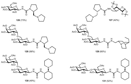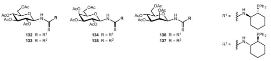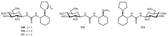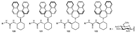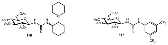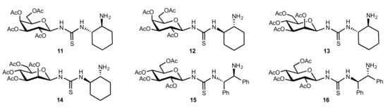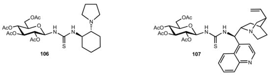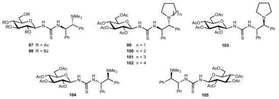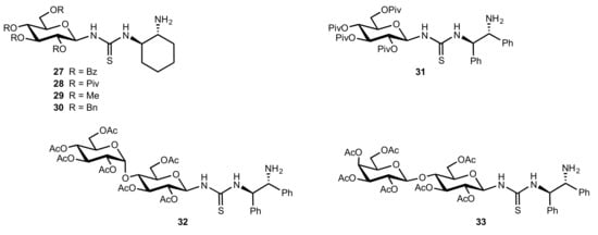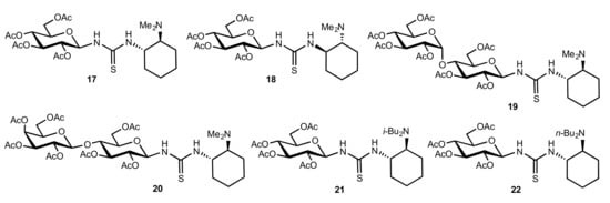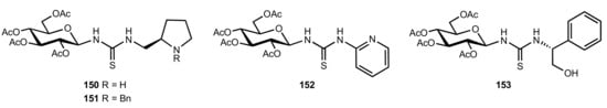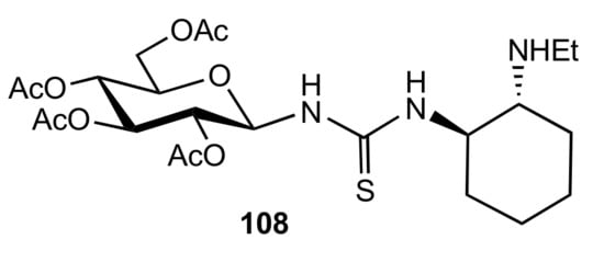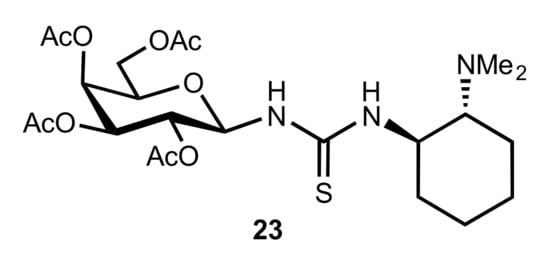 The use of cheap, easily available and configurationally stable carbohydrates as the additional source of chirality in these assemblies was introduced in 2007 [30], and since then many modifications have been described, extending their applications in asymmetric transformations. Most of these compounds were obtained from a tetra-O-acetyl-d-glucopyranose unit bearing an isothiocyanate at the anomeric position that was reacted with amines to afford thioureas.