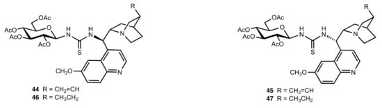 Reddy and co-workers performed an evaluation of cytotoxicity of the Michael adducts obtained in the highly enantioselective reaction of 5-hydroxy-2-(hydroxymethyl)-4H-pyran-4-one (kojic acid) derivatives with β-nitroolefins [44]. Cinchona alkaloid-derived sugar thioureas 44–47 (Figure 5), prepared in the usual way, were tested as catalysts of the process. Unfortunately, the analytical and spectral data of compounds 45–47 were not reported in the article [44].