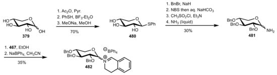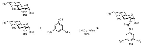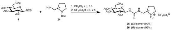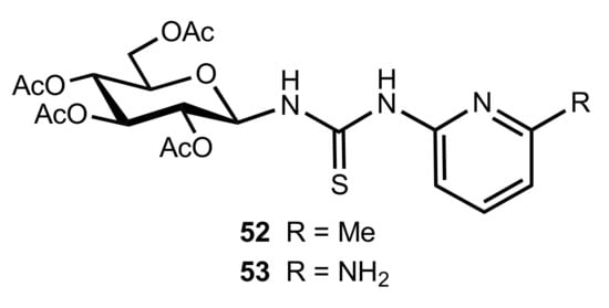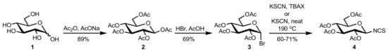 Efficient and selective methods for the preparation of carbohydrate-based isothiocyanates were introduced by several groups. In 1984, de las Heras and co-workers described the reaction of sugar halides with potassium thiocyanate in acetonitrile in the presence of tetraalkylammonium salt (hydrogen sulfate, iodide or bromide) and 4Å molecular sieves [35]. In case of acylated substrates, the products were obtained as single stereoisomers with 1,2-trans configuration (α-d anomer for mannose, β-d for glucose, in 72% and 71% yields, respectively).