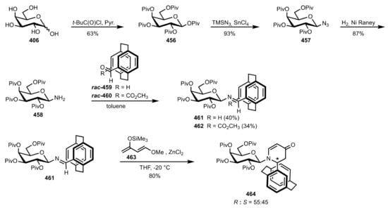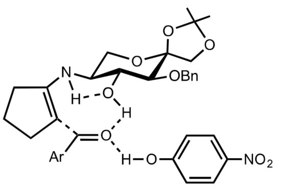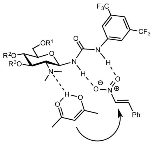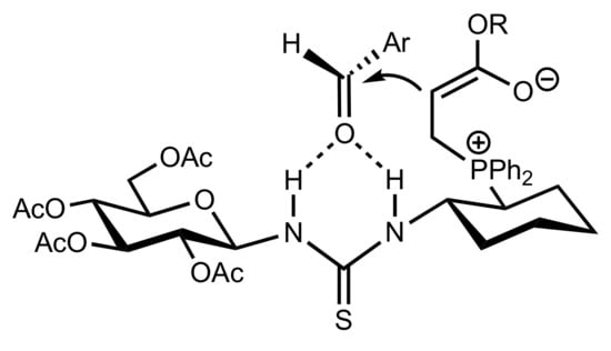 Less frequently, urea derivatives are used, typically prepared by a reaction of sugar azides reduced in situ with phosphine, CO2 and amine. In general, the proposed models explaining the stereoselectivity in the catalytic reaction involve interactions of reactants with (thio)urea and amine parts of the catalyst, the carbohydrate moiety being only responsible for providing the steric hindrance or a general chiral environment.