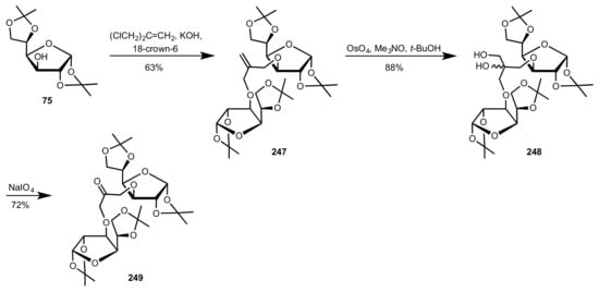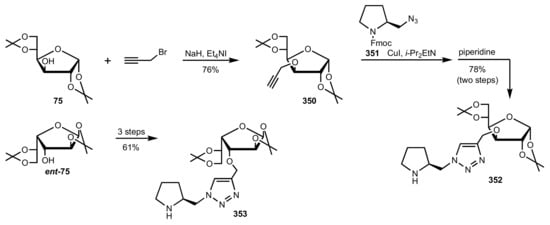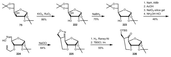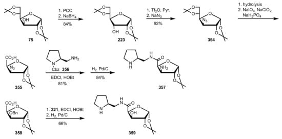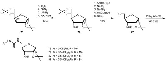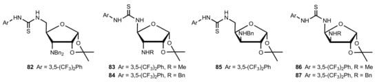 Bifunctional thiourea organocatalysts 78–81 (Scheme 17) containing d-glucose diacetonide equipped with secondary amine groups were synthesised [48] from d-glucose diacetonide 75 (in the article erroneously drawn as an l-sugar). The sugar thioureas 82–87 (Figure 8) were prepared in a similar way from 75. Unfortunately, the analytical and spectral data of all the precursors of 78–87 were missing.