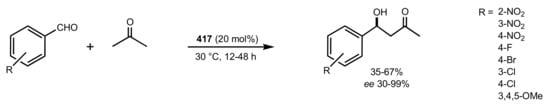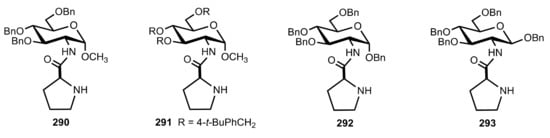 Two reviews [14,15] were focused on carbohydrate-based ligands and chiral auxiliaries, while the use of sugars as organocatalysts was only reported in a very short section at the end of the paper. A book’s chapter published in 2013 [16] reviewed the synthesis and applications of a very limited number of sugar-based organocatalysts. Another short review [17] covered the synthetic applications of various families of sugar organocatalysts without describing the preparation of the latter. A recent, short review [18] was almost exclusively devoted to sugars as phosphorous, sulphur and nitrogen ligands, and the sugar-based organocatalysts were only mentioned in a one-page section at the end of the article.