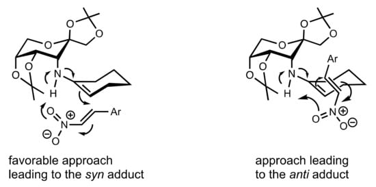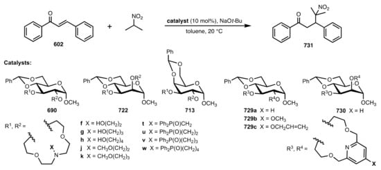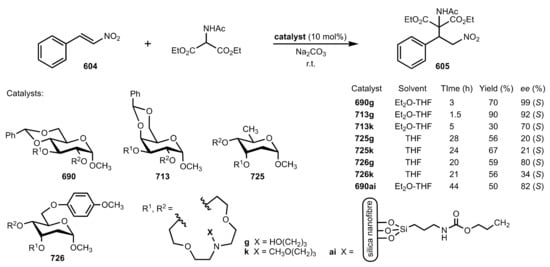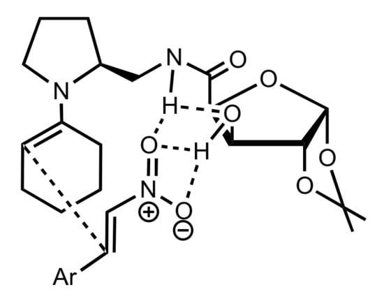 An optimization of the addition of dimethyl malonates to various nitroalkenes catalysed by the sugar-thioureas 17–22 (Figure 2) was performed by the Ma’s group [38]. The catalysts were prepared from glycosyl isothiocyanates and N,N-disubstituted 1,2-diaminocyclohexane.