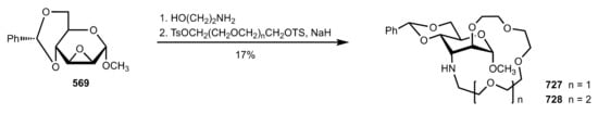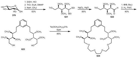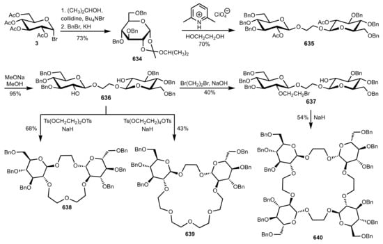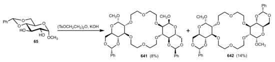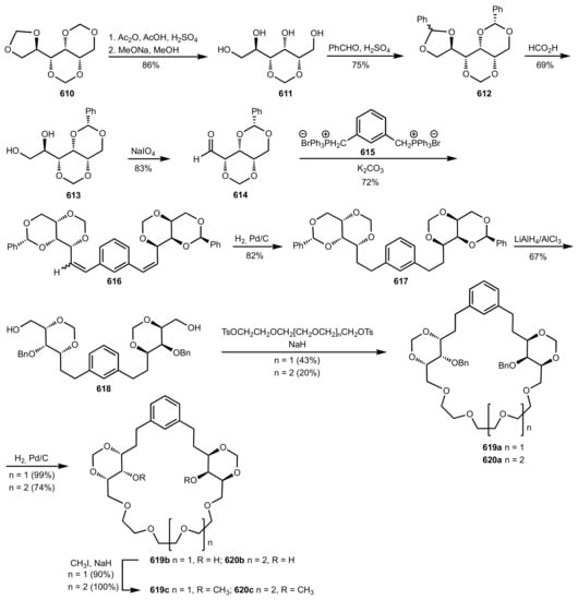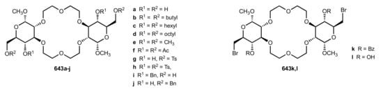 - Vicent, C.; Martin-Lomas, M.; Penadés, S. New synthetic strategy to highly symmetric chiral macrocycles from carbohydrate derivatives. Tetrahedron 1989, 45, 3605–3612. [Google Scholar] [CrossRef]