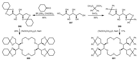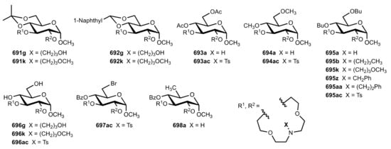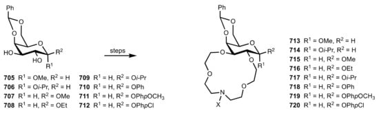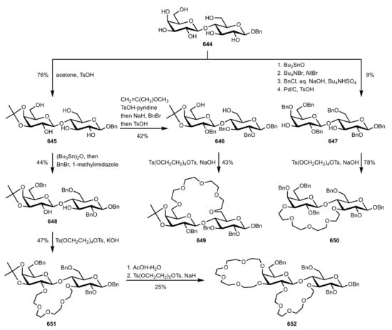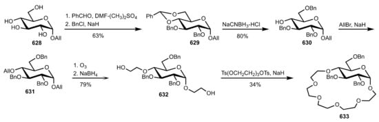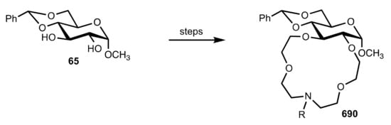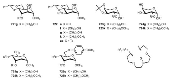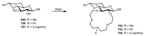 - Bakó, P.; Fenichel, L.; Tőke, L.; Czugler, M. Synthese und Komplexbildung von Kronenethern aus Methyl-4,6-O-benzyliden-α-d-glucopyranosid. Liebigs Ann. Chem. 1981, 1981, 1163–1171. [Google Scholar] [CrossRef]
