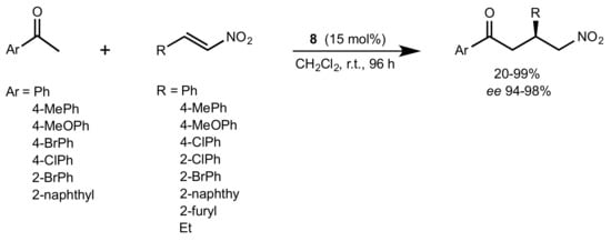 The conjugate addition of aromatic ketones to aromatic, heteroaromatic and aliphatic nitroolefins was performed in the presence of 15 mol% of catalysts (Scheme 3). Matching of (R,R)-configuration of 1,2-diaminocyclohexane with β-d-glucopyranose (catalyst 8) enhanced the stereochemical control (enantiomeric excess up to 98%).