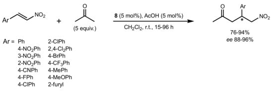 The Michael addition of acetone to nitrostyrenes catalysed by 8.