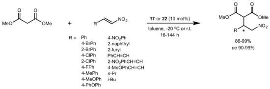 The Michael addition of methyl malonate to nitrostyrenes catalysed by 17 or 22.