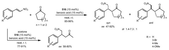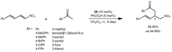 Only the products of 1,4 addition were observed, and they were formed in moderate to high yield (48–98%) and high enantioselectivity (84–99% ee). The reaction was conducted with 15 mol% of the catalyst (28 was found the most versatile) in dichloromethane at room temperature for 6 days, in the presence of 5 mol% of benzoic acid (Scheme 9 shows the addition of aryl methyl ketones). Transformation of the obtained unsaturated nitroketones into 5-substituted 3-pyrrolidinecarboxylic acids was also described.