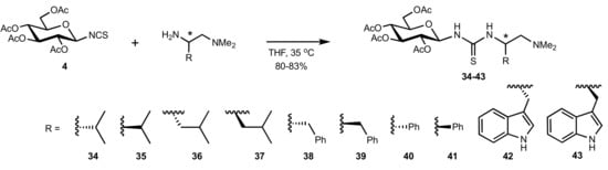 In a quest for efficient catalysts of Michael reactions, saccharide-derived thioureas were also combined with other chiral moieties. A study of the conjugate addition of acetylacetone to various nitroolefins was performed by Shao and co-workers [42,43]. They used fine-tunable organocatalysts 34–43, which were synthesised by coupling primary-tertiary diamine obtained from inexpensive l-aminoacids and glucosyl isothiocyanate (Scheme 10).