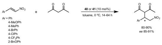 The Michael addition of acetylacetone to nitrostyrenes catalysed by 40 or 41.
